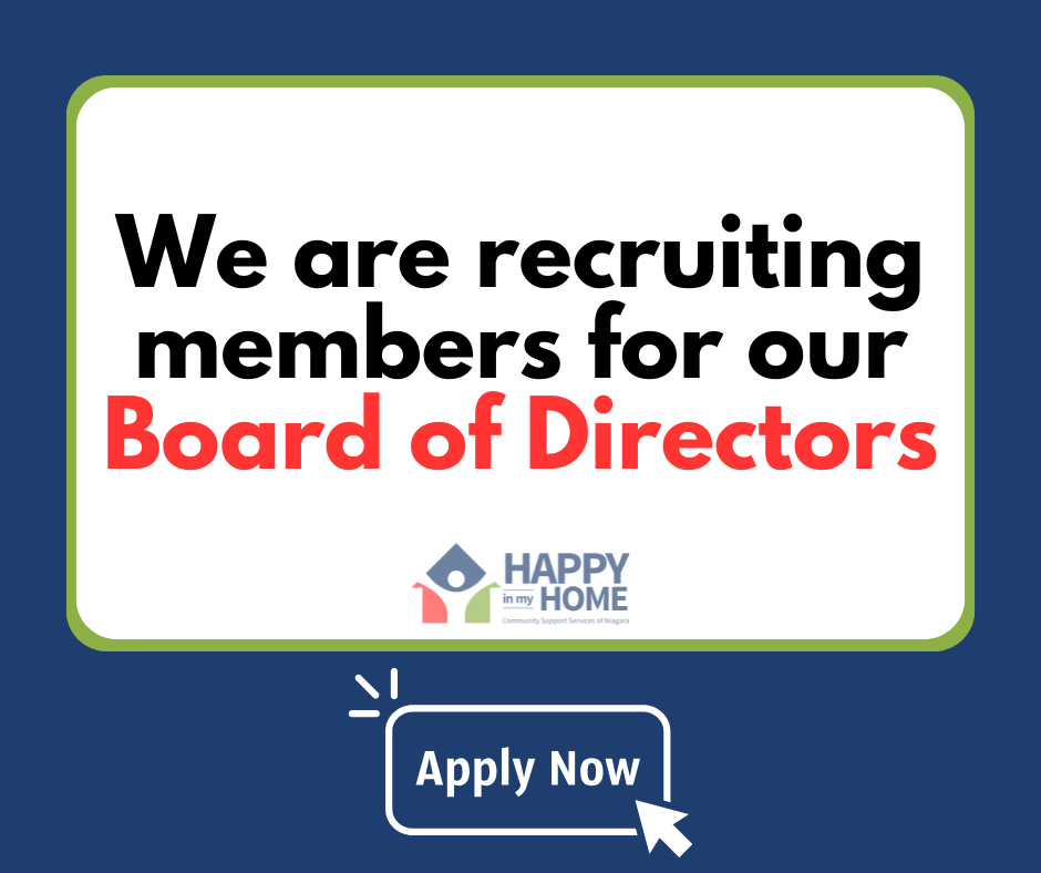 Happy in my Home, Community Support Services of Niagara is currently accepting applications for volunteer Board Members. We are seeking qualified individuals to support the strategic oversight of our operations [...]